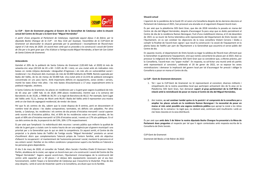 1.Tot i que la CUP-Gent de Gramenet no té representació al consistori, diverses militants i simpatitzants de la nostra assemblea local que participen activament des de fa anys en la Plataforma SOS Gent Gran, han demanat suport al grup parlamentari de la CUP-NCG en relació amb la reivindicació de posar en marxa el Centre de dia del Miguel Hernández.