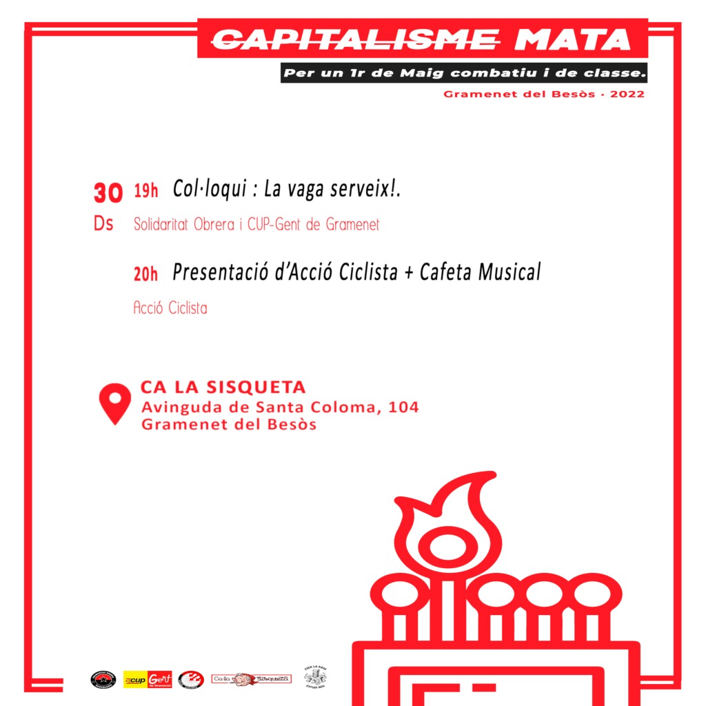 - A les 19h, col·loqui “La vaga serveix!” amb testimonis i casos d’èxit on es demostra que la lluita és el camí (organitzada per Solidaritat Obrera i nosaltres)