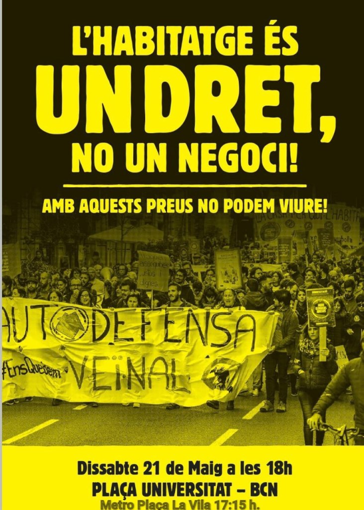 - El dissabte 21 de maig a les 18h a la Pl.Universitat de Barcelona hi ha convocada una mobilització unitària per exigir mesures en favor del dret a un habitatge digne i contra l’estafa de la carestia de la vida. Podeu llegir-ne el manifest complet aquí