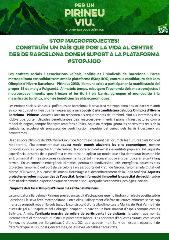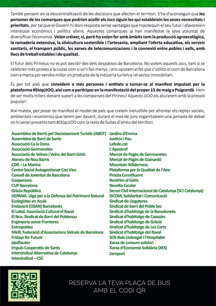 - El diumenge 15 de maig, a les 12h, també hi ha convocada a Puigcerdà una mobilització en contra del projecte de JJOO al Pirineu. Podeu llegir-ne el manifest complet aquí Si voleu reservar places per anar-hi en autocar, podeu omplir aquest formulari