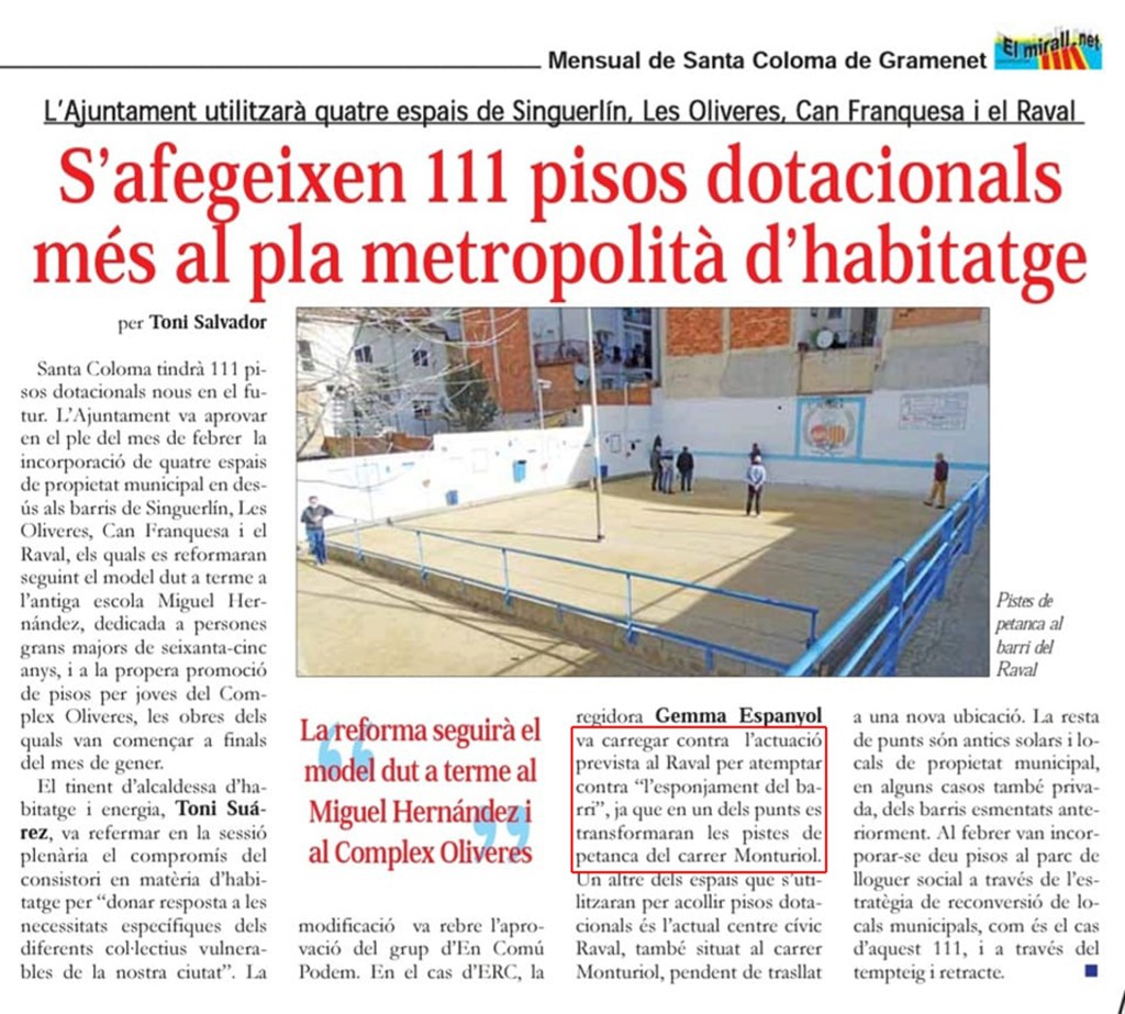 El que cal, però, és resoldre aquests dèficits i no prendre espais per construir-hi més habitatge, havent-hi més de 2000 pisos buits a la ciutat. Encara som a temps de salvar les pistes de petanca, bàsquet i el jardí, espais tots ells recuperats amb la lluita de les veïnes els anys 70.