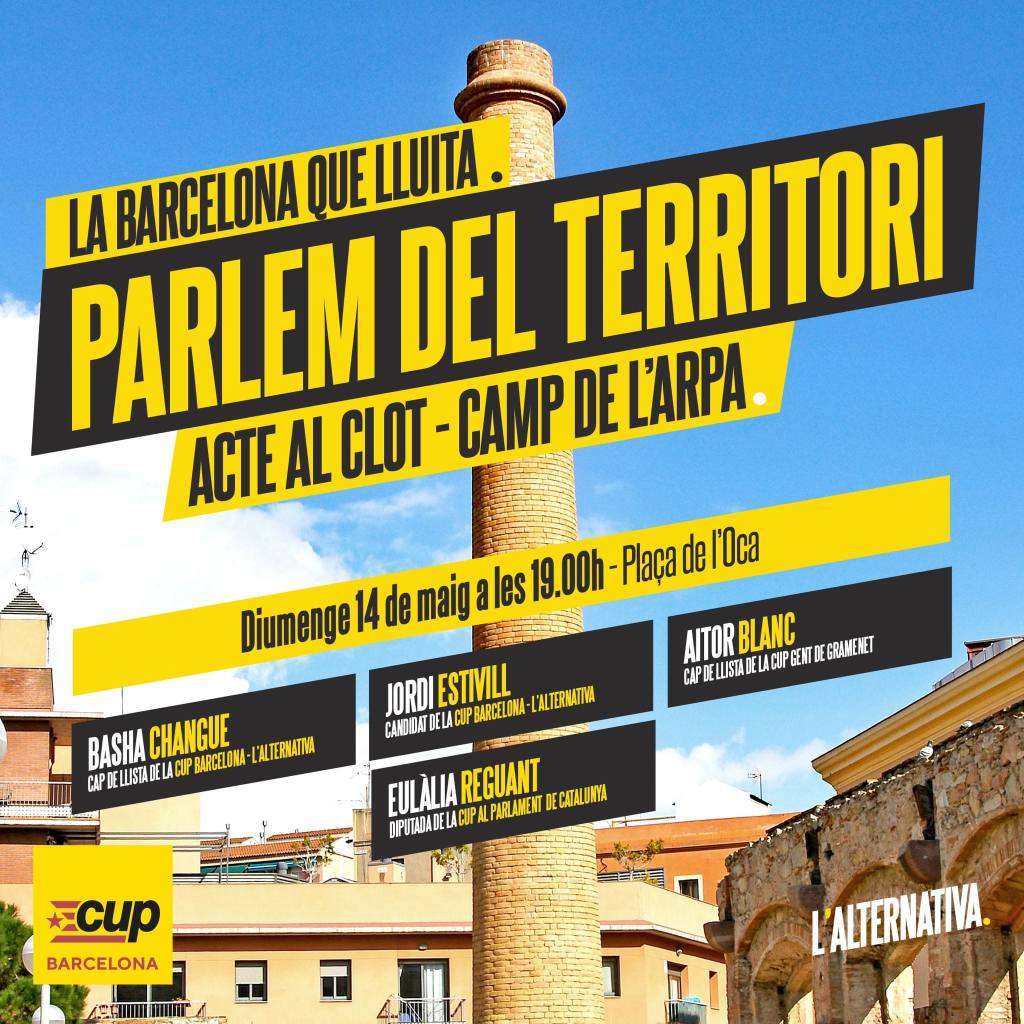 PD: I a la tarda, el nostre candidat Aitor Blanc estarà a Barcelona, al Clot-Camp de l’Arpa parlant sobre la complexitat del territori metropolità front el model de la marca Barcelona. Amb la Basha Changue, el Jordi Estivill i l’Eulàlia Reguant