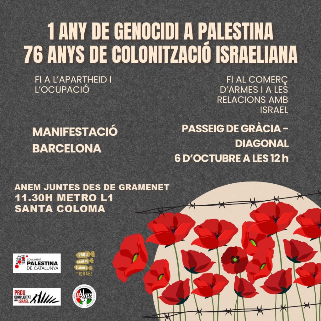 Aquest diumenge al matí sortim als carrers en solidaritat amb el poble palestí. Sortirem des de Gramenet a les 11.30h (Metro Santa Coloma). L’inici de la manifestació és a les 12h al Pg. de Gràcia amb Diagonal