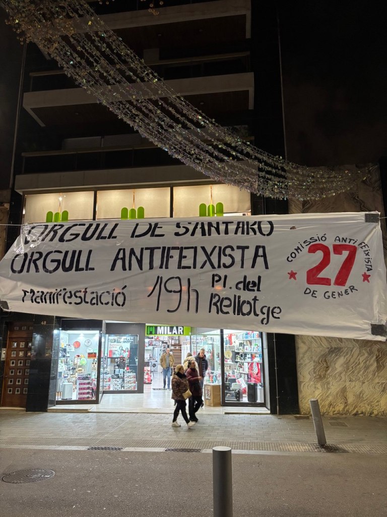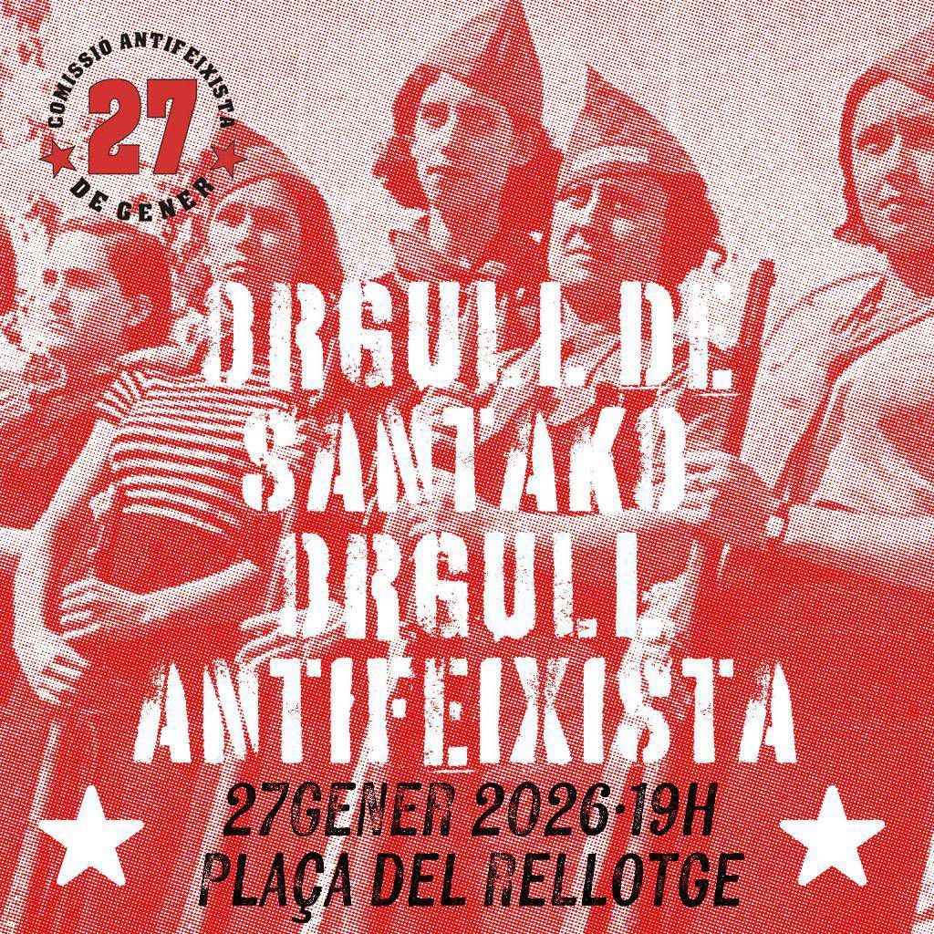 La comissió 27G convoca manifestació el 27 de gener a les 19h a la Plaça del Rellotge. El nostre lema “Orgull de Santako,Orgull Antifeixista” ho diu tot. El feixisme no passarà a la nostra vila perquè nosaltres ho aturarem. Més que mai hem de ser moltes,us hi esperem!
