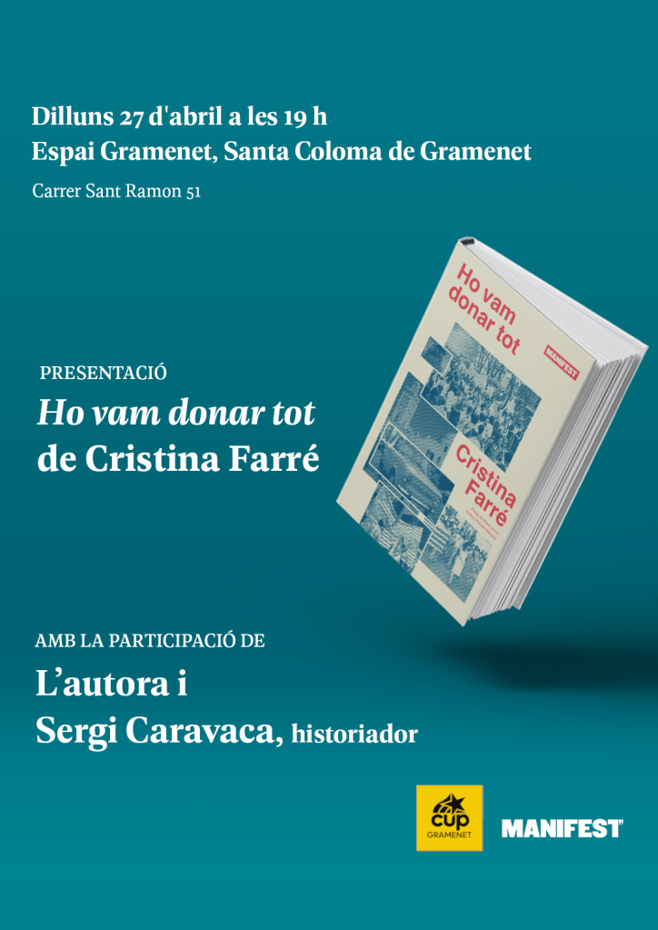 Tot just passat Sant Jordi, el dilluns 27 d’abril a les 19h a l’Espai Gramenet presentem el llibre “Ho vam donar tot” de la Cristina Farré, amb l’autora.