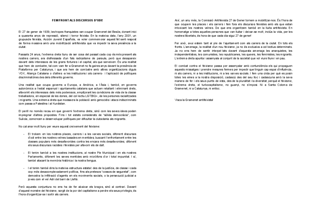 En la conjuntura actual, ens sobren motius per mantenir encesa la flama de la lluita antifeixista. Aquest any la manifestació unitària, convocada per la Comissió Antifeixista 27G serà el mateix 27 de gener a les 18 h a plaça Rellotge.
