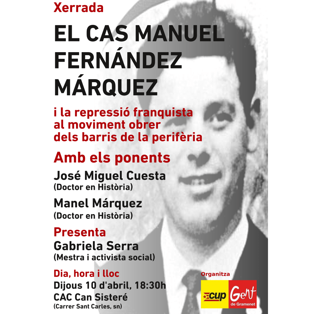 Dijous 10 d’abril, a les 18:30h a Can Sisteré, explicarem l’assassinat de Manuel Fernàndez Màrquez i la repressió franquista al moviment obrer dels barris metropolitans amb la Gabriela Serra, el Manel Marquez i en José Miguel Cuesta.