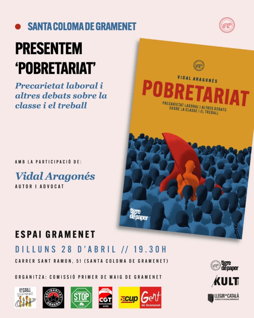 El dilluns 28 d’abril a les 19:30h a l’Espai Gramenet t’esperem per a xerrar i debatre sobre precarietat laboral i classe obrera en la presentació del llibre “Pobretariat” del Vidal Aragonès (Tigre de Paper). Escalfem motors per l’1 de maig!