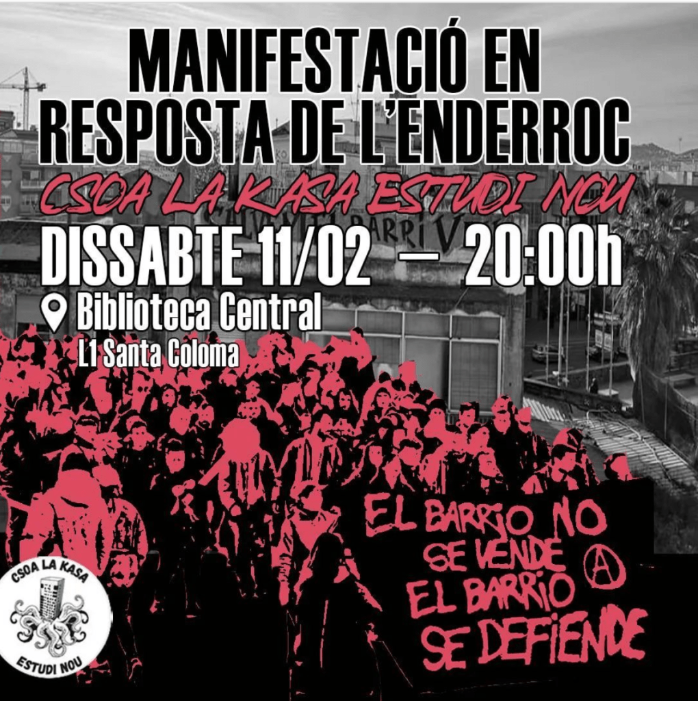 - Dissabte 11 de febrer a les 20h a la porta de la Biblioteca Central, manifestació en protesta a l’enderroc al Barri Antic convocada pel CSOA LaKasa-Estudi Nou