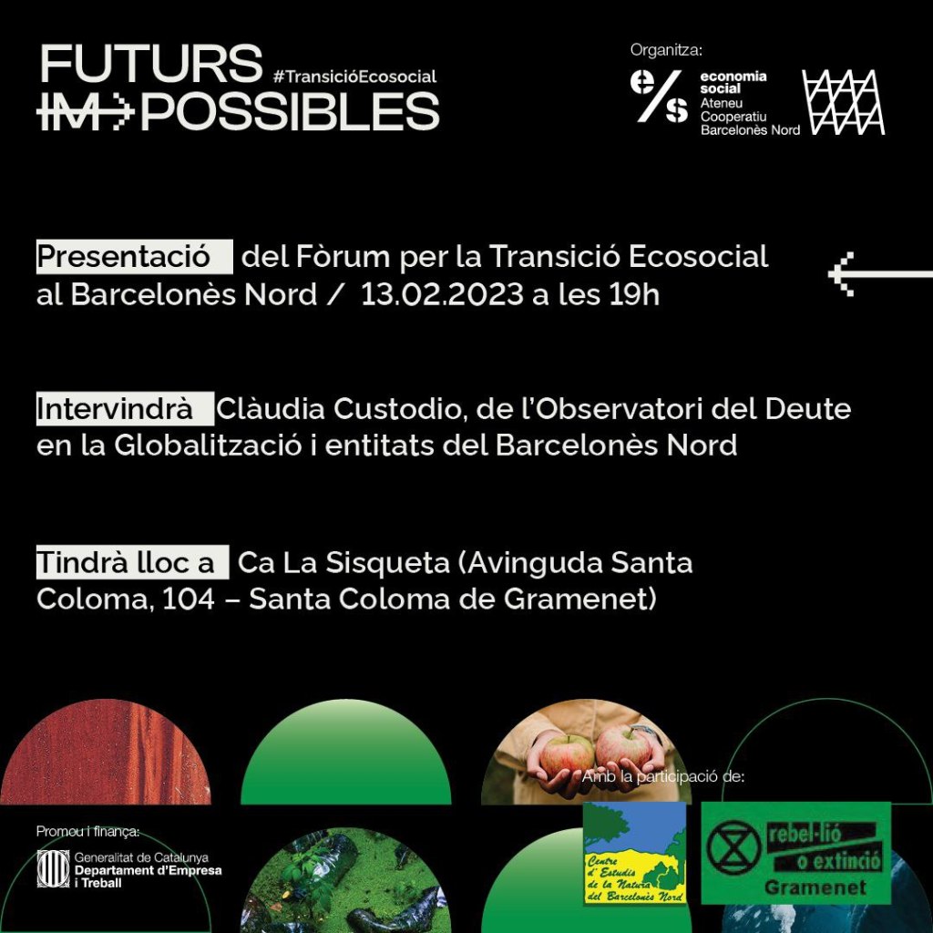 - Dilluns 13 a les 19h a Ca la Sisqueta, presentació del Fòrum per la Transició Ecosocial al Barcelonès Nord, organitzat per l’Ateneu BNord, Rebel·lió o Extinció Gramenet i el Centre d’Estudis de la Natura BNord