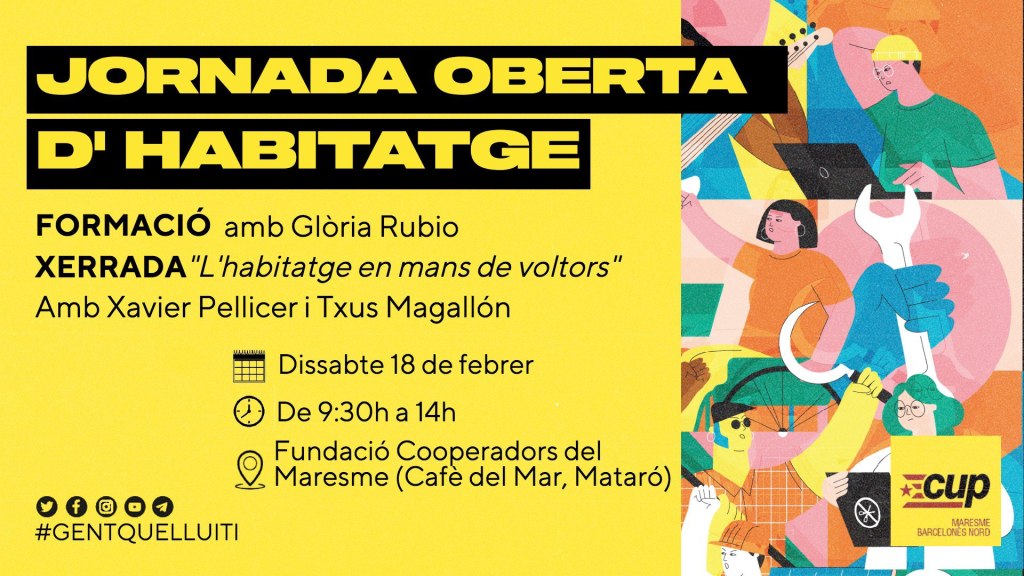 - Dissabte 18 de febrer de 9:30h a 14h al Cafè del Mar de Mataró, jornada oberta d’habitatge on estan convidades totes les persones, entitats i col·lectius involucrats en aquesta lluita. Està organtizada per la Territorial de la CUP-Maresme Barcelonès Nord i el formulari d’inscripció és aquest