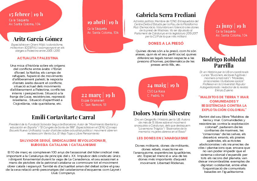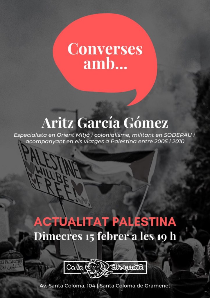 - Dimecres 15 de febrer a les 19h a Ca la Sisqueta també, inici del cicle de xerrades “Converses amb…”, en aquest cas amb Aritz García Gómez per parlar de la situació actual a Palestina