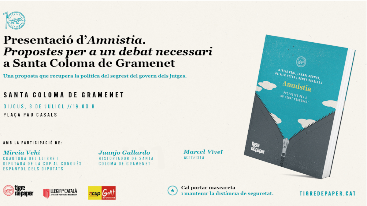 El proper dijous 8 de juliol a les 19h a la Plaça Pau Casals presentem el llibre “Amnistia. Propostes per a un debat necessari” de l’editorial Tigre de Paper i hi comptarem amb la presència de la Mireia Vehí, coautora i diputada de la CUP Nacional i en Marcel Vivet, activista de la CUP i Guanyem Badalona. Moderarà en Juanjo Gallardo, historiador i militant de la nostra assemblea local.