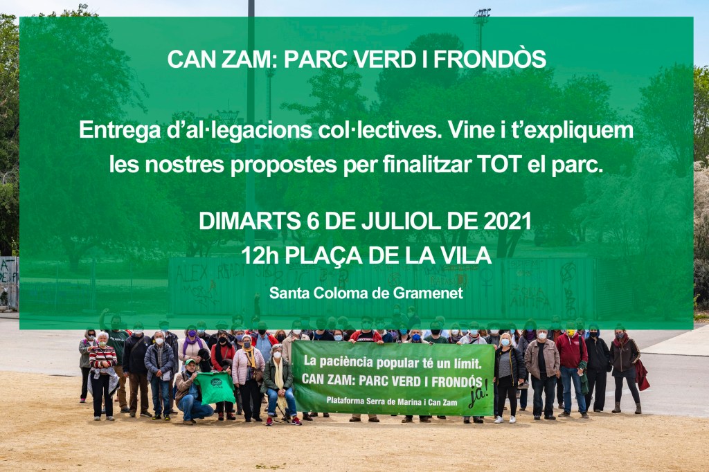 La Plataforma en Defensa de la Serra Marina i Can Zam (a la qual pertany la CUP-GG) entregarà demà dimarts 6 de juliol a les 12h les al·legacions al projecte del nostre Ajuntament respecte a la 2ª fase del Parc de Can Zam.